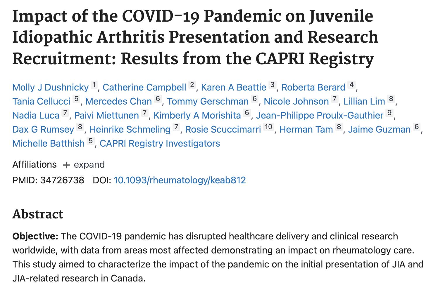 Molly J Dushnicky, Catherine Campbell, Karen A Beattie, Roberta Berard, Tania Cellucci, Mercedes Chan, Tommy Gerschman, Nicole Johnson, Lillian Lim, Nadia Luca, Paivi Miettunen, Kimberly A Morishita, Jean-Philippe Proulx-Gauthier, Dax G Rumsey, Heinrike Schmeling, Rosie Scuccimarri, Herman Tam, Jaime Guzman, Michelle Batthish, CAPRI Registry Investigators
